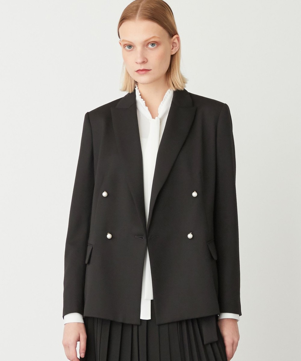下画像は、パールボタンがアクセントとなった華やかな「BEIGE,ベイジ,」のFRESNAY/テーラードジャケットです。ピークドラペルカラー(先がとがった襟の形)ジャケットで、チュールスカートと合わせても甘さが抑えられスタイリッシュにお召しいただけます。