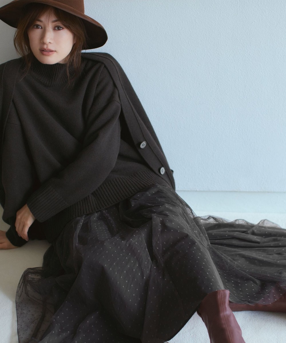 とはいえ「組曲のチュールスカート」はドット柄になっているため可愛らしい印象になり、大人女性は少し着るのをためらうかもしれません。そこでこのページでは「甘×辛コーディネート」でメリハリをつけ、スタイリッシュにお召しいただく方法をお伝えしております。