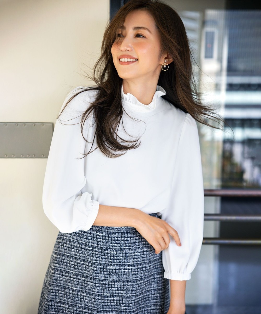「組曲」【VERY3月号掲載・NAVY】コンフォータブルドレープフリル テーパードパンツ ネイビー系の着用例を紹介させていただきます。「組曲」【NAVY・セットアップ着用可】コンフォートダブルドレープパンツでも同じようにコーディネートしていただけます。