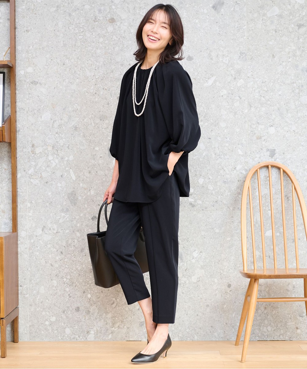 下画像が、シンプル上品なトップスとテーパードパンツを組み合わせた「any FAM」【セットアップ・洗える】フォーマルセットアップ(福田麻琴さんコラボ)です。トップスは首元のギャザーが上品なデザインですので、ジャケット要らずできちんと見えが叶います。