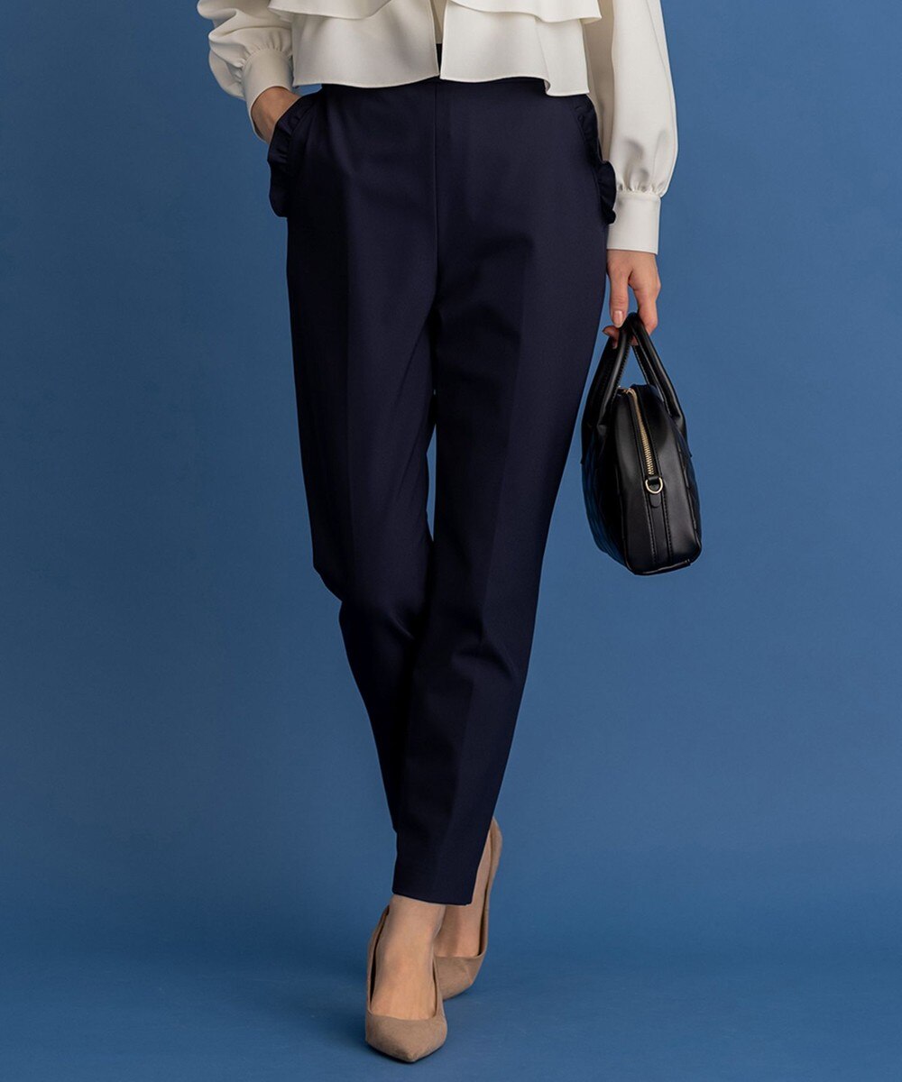 下画像が、セレモニーシーンから通勤シーンまで幅広くお使いいただける「23区」【セットアップ対応】トリアセダブルジョーゼット パンツです。上画像のブラウスと合わせてセレモニーセットアップとしてお召しいただけます。