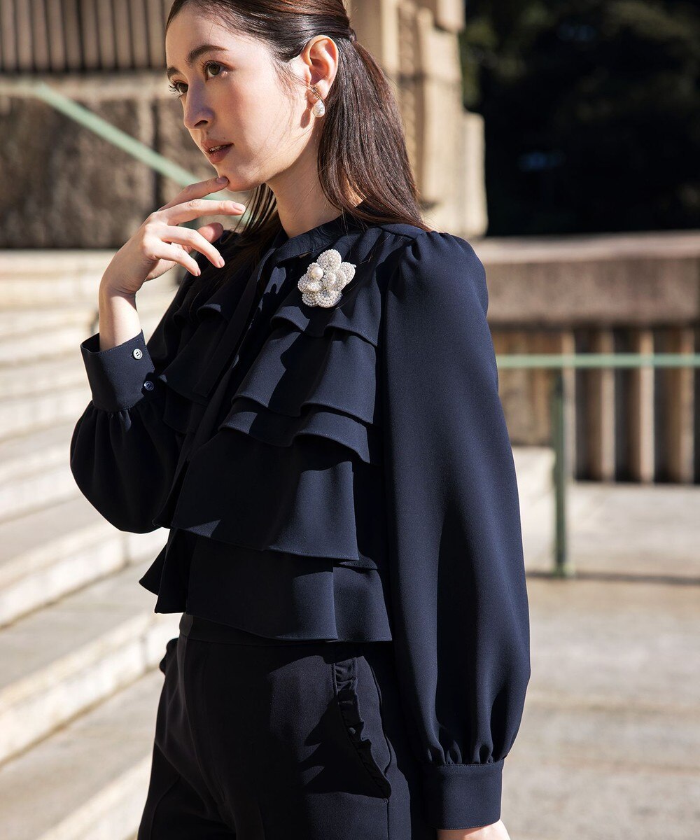 セレモニーに着用する場合は、華やかさが必要です。「組曲」【VERY掲載・NAVY】コンフォーダブルサテンブラウスは、フロントのフリルデザインが今年らしく華やかにお召しいただけます。