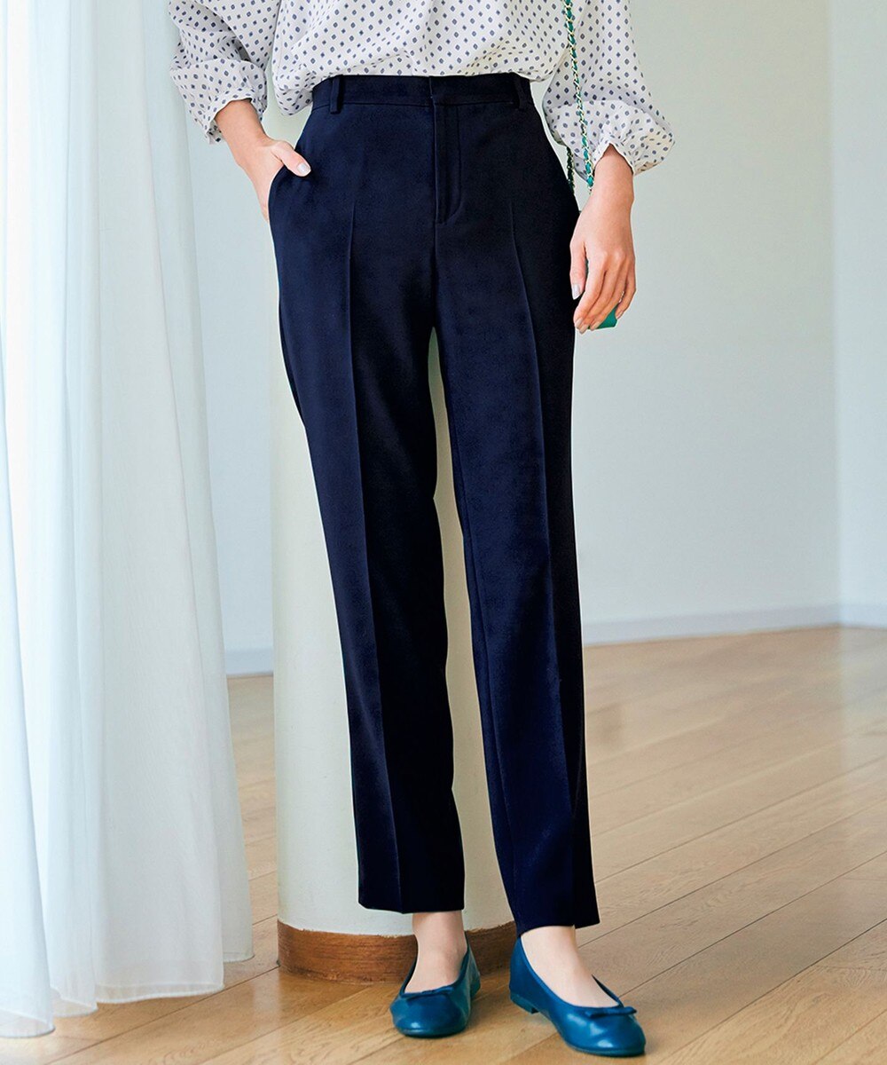 下画像が、「組曲」【NAVY】ダブルクロスストレッチパンツです。ややハイウエストでスッキリとしたシルエットのテーパードクロプトパンツで、シルエットがとてもキレイです。