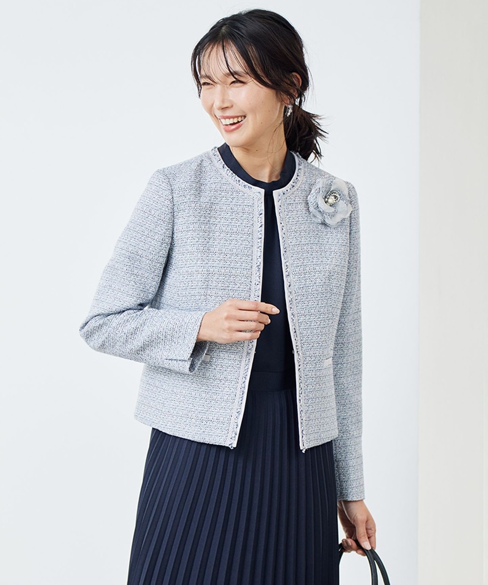 下画像は、「23区」【セットアップ対応】ライトシャインツイードノーカラージャケットです。コミュニケーション・マナー系のセミナー講師の場合は、上品で柔らかい雰囲気のノーカラージャケットがお勧めです。