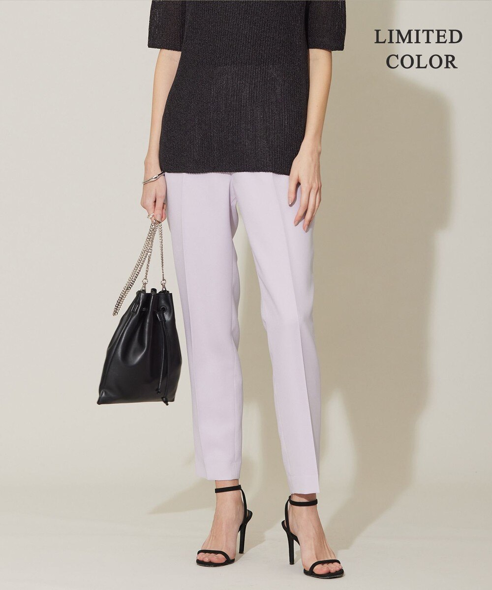 下画像は、上画像のジレと同素材の【先行予約・接触冷感・UVケア・速乾】FluidBackSatin ドロストパンツです。「ICB」【洗える】ライトダブルクロス ペプラムブラウス とお揃いのパンツを合わせて頂いても良いですが、キレイな色のパンツを合わせると春らしくなりますのでおすすめです。