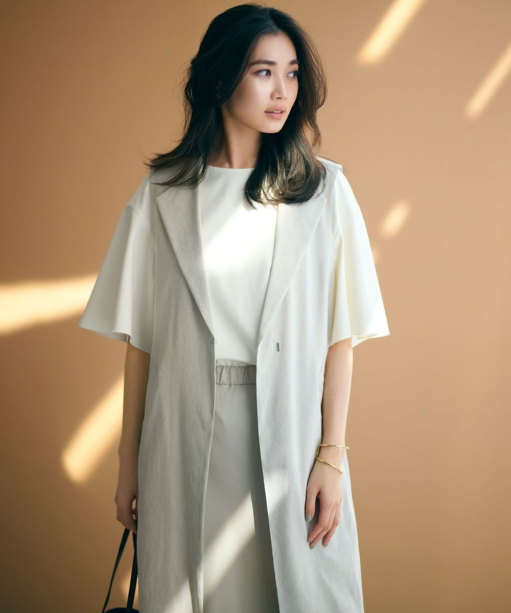 下画像は、きちんと感とリラックス感を兼ね備えた「23区」【CLASSY.6月号掲載】リネンレーヨンストレッチ ロング ジレです。ブラウスとスカートのセットでもよいですが、ジレを合わせるとスタイリッシュで今風の着こなしになります。