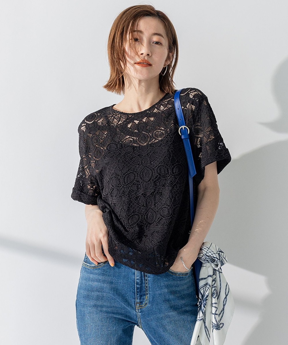 下画像は、「23区」【蛯原友里さん着用/洗える】レースブラウスです。「自由区」のブラウスより若干カジュアルにはなりますが、デニムライクシャンブレーワイドパンツとコーディネートしてインフォーマルとしてお召しいただけます。
