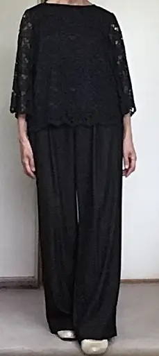 ワイドパンツはどちらかといえば苦手なデザインですが、着てみた結果思った以上にきれいに着られてよかったです。セットで着用すると、「きちんと感」がアップするのでインフォーマルとして十分活用できそうです。